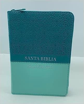 Reina Valera 1960, tamaño bolsillo (100×140 mm), Imitación piel turquesa/turquesa con índice y cierre, palabras de Jesús en rojo. Concordancia amplia de palabras de la Biblia, concordancia personajes. 32 páginas a todo color con ayudas y esquemas. 12 mapas a todo color .Referencias cruzadas. Letra: 8,5 puntos.