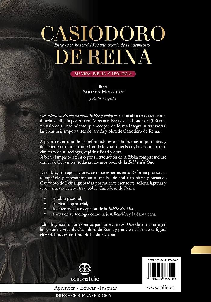 Casiodoro de Reina: su vida, Biblia y teologia: Su vida, Biblia y Teología es una colección de ensayos en honor del 500 aniversario de Casiodoro de Reina, uno de los reformadores españoles más importantes de la época, su vida y su legado. Casiodoro de Reina es uno de los reformadores españoles más importantes, pero hasta hoy sabemos relativamente poco de su obra y teología. Aunque el impacto literario de su traducción de la Biblia compite incluso con el de Cervantes, todavía sabemos poco de la Biblia del Oso. Este libro, con aportaciones de once expertos en la Reforma protestante española y aprovechándose de casi cien obras y cartas de Casiodoro de Reina que han sido ignoradas por muchos escritores, rellena estas lagunas y ofrece nuevas perspectivas sobre Casiodoro de Reina: su obra pastoral, su vida empresarial, las fuentes y recepción de la Biblia del Oso y varios temas de su teología, como La justificación y Santa cena. El libro se divide en tres bloques principales por expertos historiadores: Vida y las obras de Casiodoro de Reina (Pastor, Maestro y empresario) La Biblia del Oso (Antiguo y Viejo Testamento junto a material no bíblico) Temas teológicos (protestante y su doctrina)